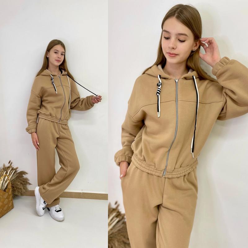 Костюм очень теплый и удобный Худи с капюшоном Ткань-трехнитка на флисе, Турция. Не кашлатиться Рекомендую рост/длин.худи/пог/рукав от горловины/длин.штанов/крок/пот/поб похибка+-2см 140/46/47/58/84/61/26/46-2шт 146/48/49/60/88/64/27/48-1шт 152/50/51/63/91/67/28/49-1шт 158/52/52/66/94/70/29/51-1шт
