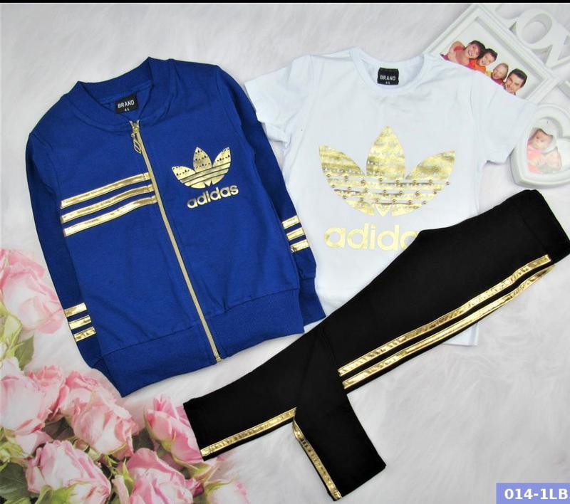 пр-під Туреччина. шикарний костюм трійка " "Adidas" на дівчинку. тканина 100% бавовна. сезон весна-літо. виміри зроблені від руки(по одній ростовці) і можуть відрізняться +-1-2 див виміри: реглан:довжина/ширина/рукав футболка:довжина/ширина лосини:довжина/крок/попа 4/5--р. 42/32/39 ф-ка 42/31 л. 60/43/27 5/6--р. 44/34/40 ф-ка 44/32 л. 65/46/28