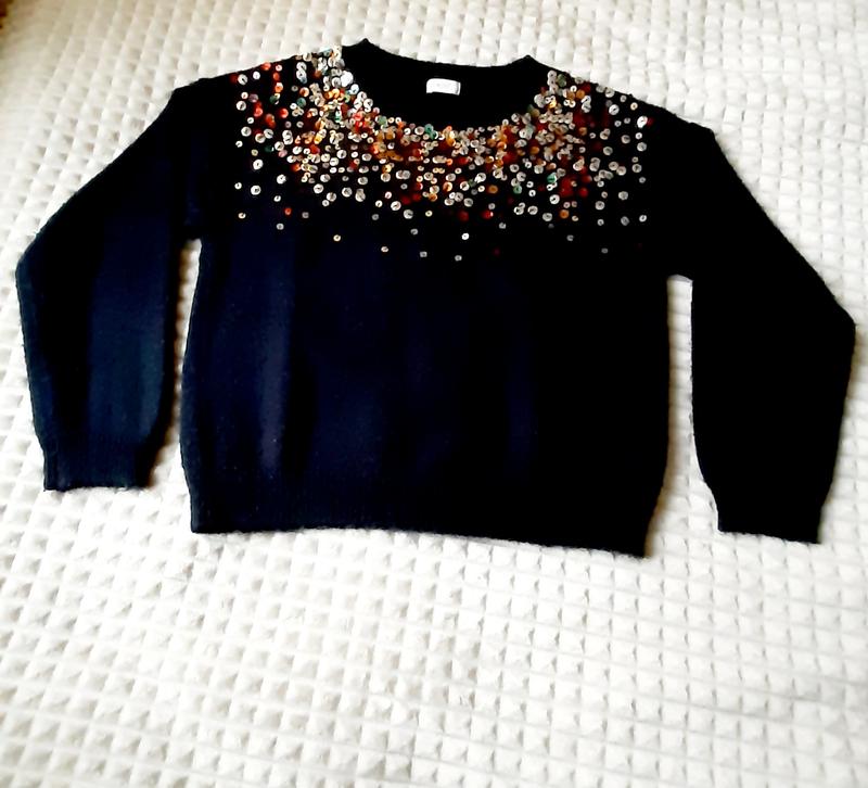 Светрик темно-синього кольору, прикрашенний яскравими блистками, пришиті добре, всі на місці. Розмір 9 років. Стан ідеальний, теплий, м'який, не маркий. Заміри: довжина 44см., ПОГ 42см., рукав 40см