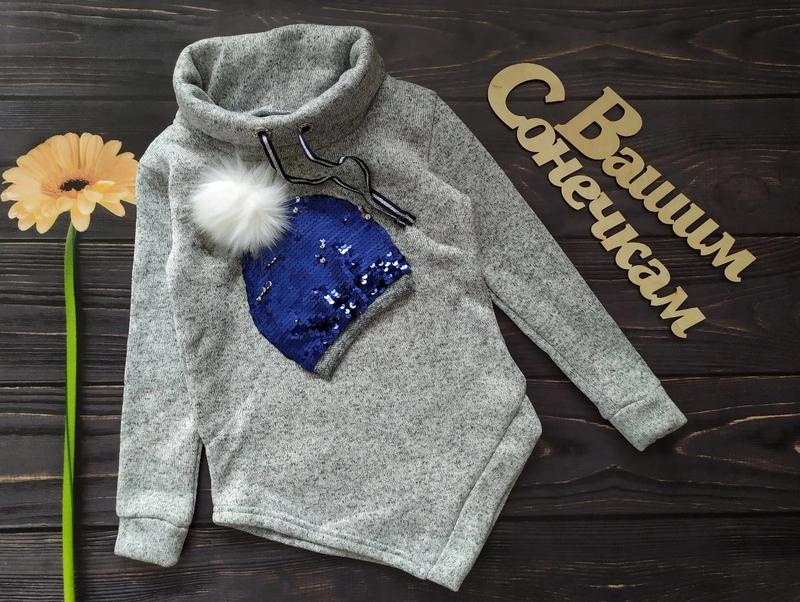 Джемпер тканина тринитка на байці якість супер прикрашено мехом, аплікація з рукавичками нашита,можна використовувати як кишені паєтки- перевертиші р122-128-1 шт Заміри: р 122-128-довжина 41 см, рукав 42 см, ширина в грудях-35 см похибка 1.5 см