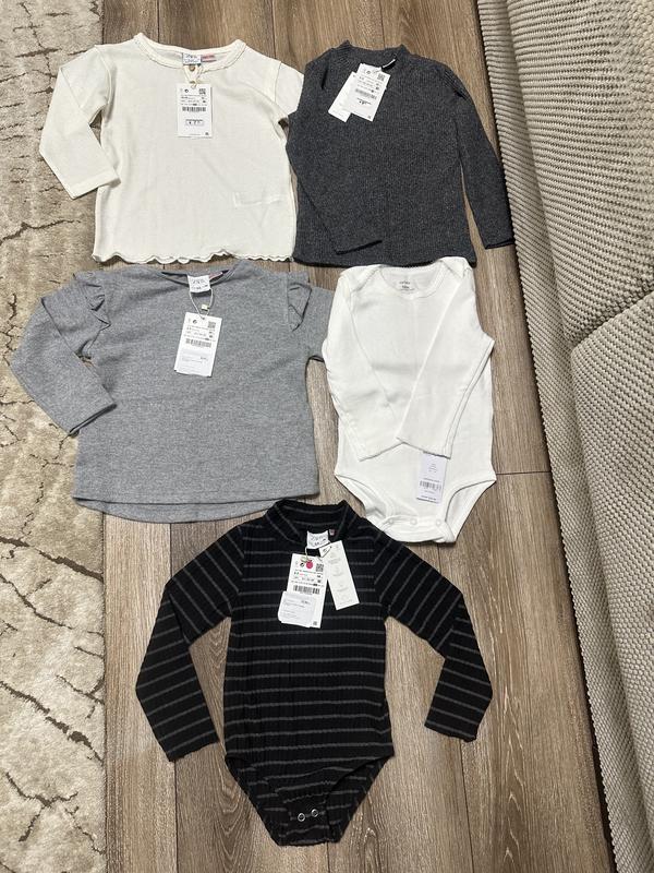 НОВІ гольфіки ZARA. Усі купувала на знижці, а по факту не встигли поносити. 1) білий р. 18-24(більшемірить на 2-3р) 280грн. 2) сірий під шию р. 2-3р. 300грн. 3) сірий р. 2-3р. 300грн. 4) боді CARTERS р. 18міс.(більшемірить) 300грн. 5) боді ZARA під шийку р. 2-3р. 320грн.