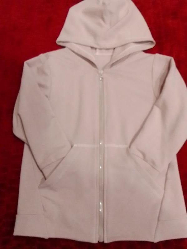 светр на замочку з кишеньками і капюшоном пастельно рожевого кольору з блиском на розмір 104-110. Довжина 47 см., ширина плечей 31 см., довжина рукава 37 см.