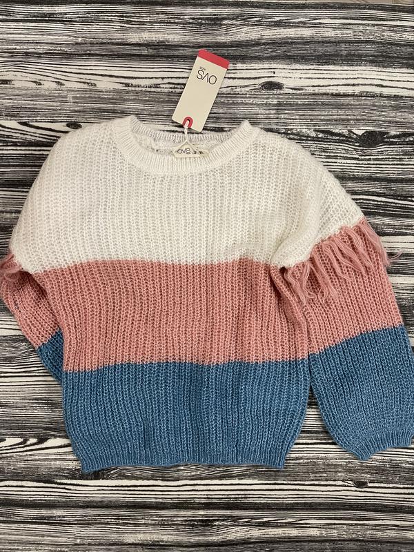 Стильний, ніжний та оригінальний дівочий светр з китицями на рукавах, в гарному поєднанні кольорів, від італійського бренду OVS стане окрасою образу маленької принцеси. Вік 5-6 років Зріст 116 см Вартість краси 449 грн. (По бірці 19,99 €) €)