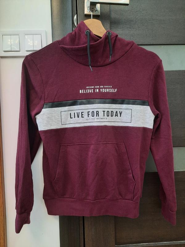 Теплий светр для дівчинки. бордового кольору. має воротник. катож велика кишеня присутня. ширина приблизно 40 см, довжина 51 см, рукав приблизно 54 см.
