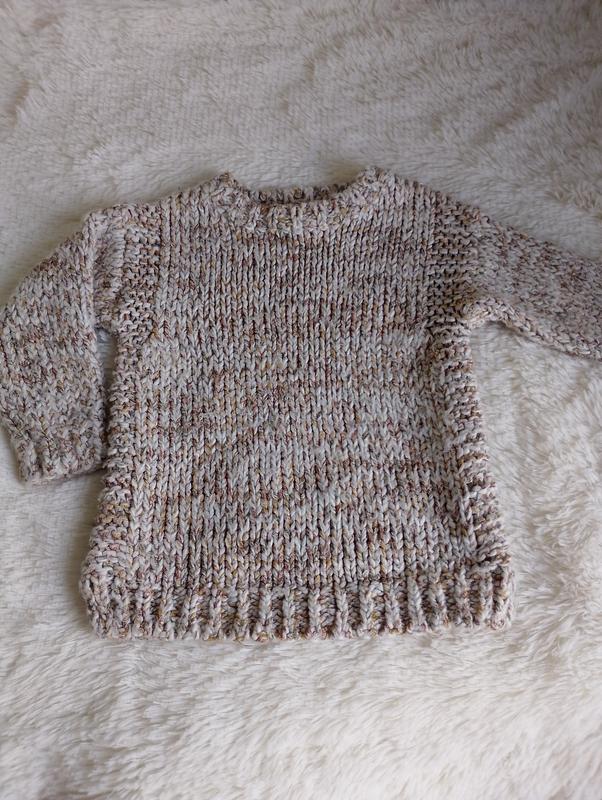 мякенький. приємний на дотик. машинна в'язка. розмір вказано на 5 років. донька носила з 4-х. ширина під пахвами 29 довжина 40 рукав 31