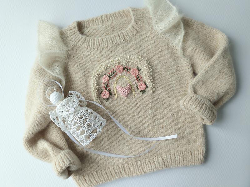 Вязаный нарядный свитерок для девочки, с рюшами на плечиках и красивой вышивкой Радуга, дополнит гардероб вашей модницы. Свитерок очень теплый, выполнен из ниток с натуральным составом, он очень легкий, прям воздушный.