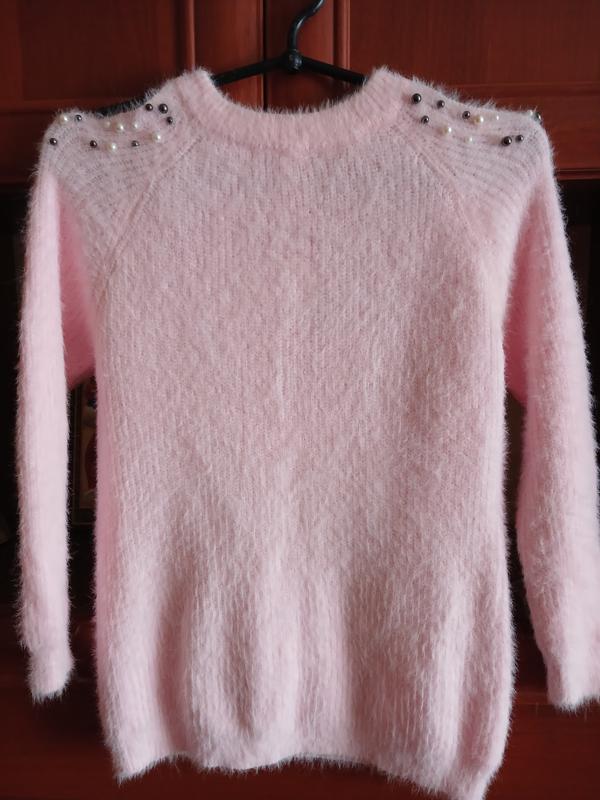 Ніжно-рожевий светр із ангори, теплий та стильний. Стан відмінний, на плічках розріз і прикрашений бусинами. Підійде на дівчинку 11-13 років, але краще орієнтуватися на виміри