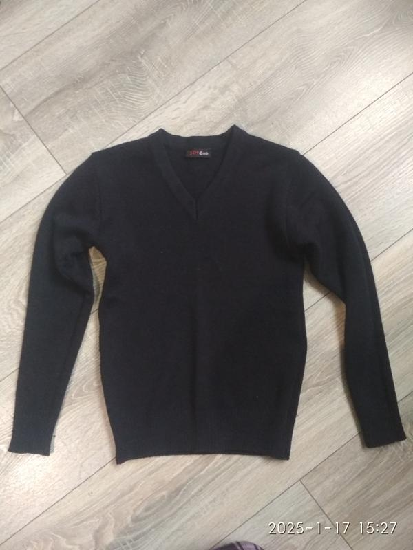 Светр темно синій, практично чорний SOFline стан ідеальний розмір 122-128 50% вовна, 50% період довжина 48 см, рукав 46 см, по плечах 31 см,пог 32 см