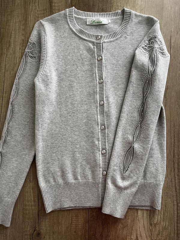 Святкова тепленька кофтинка на дівчинку з стразами та дуже гарним візерунком на рукаві. Розміри: • довжина виробу: 56 см • півширина по низу вироба: 35 см • напівобхват грудей: 37 см • напівобхват шиї: 22 см • довжина плеча: 10 см • напівобхват пройми: 22 см • довжина рукава: 57 см • напівобхват по низу рукава: 7,5 см В ідеальному стані, була одягнена декілька разів. Дефектів НЕМАЄ.