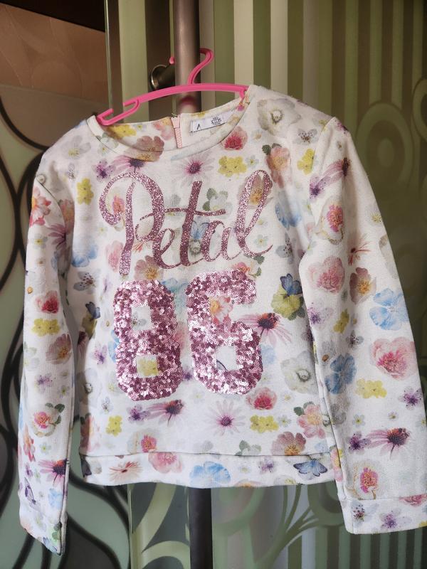 Дуже гарний светрик в квіточки з паєтками та блискучим надписом, на 7-8 років, з дефектів маленька катишка