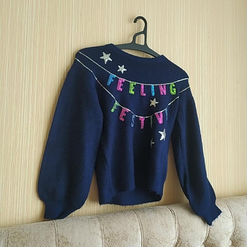 Теплий фірмовий светр для дівчинки темно-синього кольору з рукавами-буфами. Нарядно виглядає. Стан нового. Довжина -48 см Довжина рукава від плеча - 47 см Напівоб'єм між пахвами -42 см