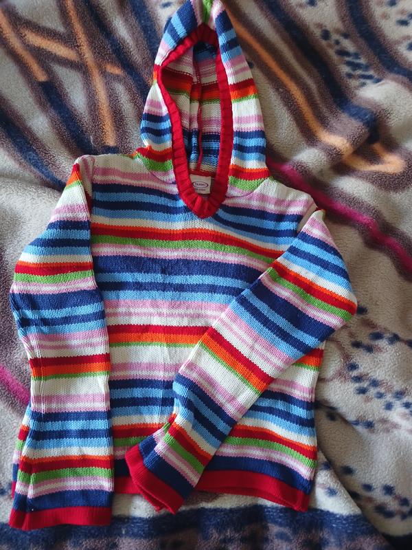 Продається яскравий дитячий светрик з капюшоном у гарному стані. Підійде для дитини 4–6 років (орієнтовно розмір 110-116 см). Зручний.. Має різнокольорові смужки, червону окантовку та капюшон — ідеально для прохолодної погоди