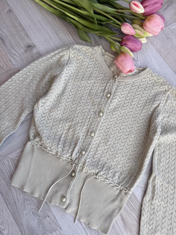 Светер на гудзичках та стяжці котон вязка тоненький. Заміри на фото.