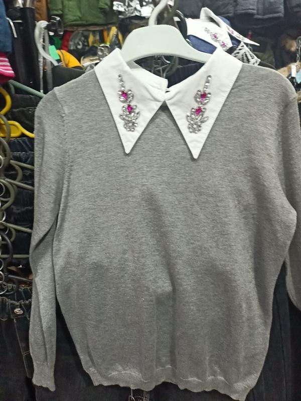 тоненький светр для дівчинки сірого кольору з відкладним білим комірцем, який на спинці застібається на гудзик. в комплекті є запасний гудзик. рукава і низ виробу на манжетах. светр тоненький м'якенький і приємний до тіла.