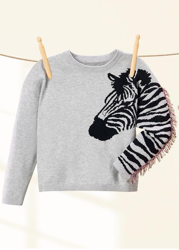 Виміри: Розмір 98-104: НОГ-33 см, довжина-35 см, рукав від горловини-42 см. Розмір 110-116: НОГ-35 см, довжина-39 см, рукав від горловини-48 см. Розмір 122-128: НОГ-37 см, довжина-44 см, рукав від горловини-52 см. В'язаний светр з м'якого бавовняного трикотажу від бренду Lupilu.Великий принт спереду. Рукави з вишивокю з ниток- імітація гриви. Ребристі манжети на вирізі та подолі. Природний комфорт завдяки органічній бавовні.