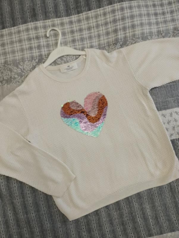 Гарненький светрик з пайєтками молочного кольору від H&M р.134-140. Гарний стан, єдиний нюанс маленька плямка на рукаві. Довжина 48 см, плечі 40см, рукав 50см, ширина під рукавами 44 см.