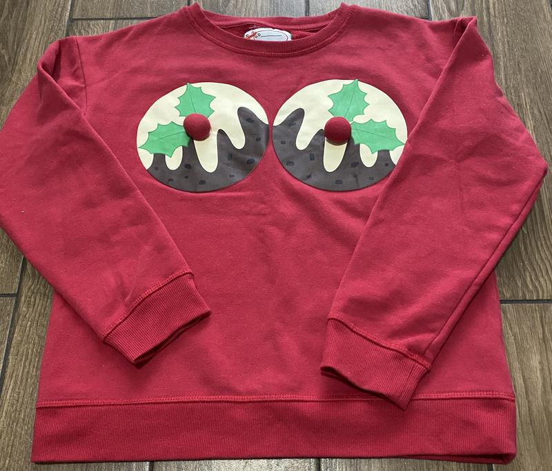 Светр - світшот UK/IRL - 6-8 ES/PT - 34-36 D/NL/B/A - 32-34 Яскраво - червоний светр або свіншот із зображенням двох різдвяних пудингів із кремовою глазуррю і листям падуба та червоними помпонами ягодами на грудях. Круглий виріз горловини. Має мʼяку флісову підкладку та ребристу горловину та манжети. 60% котон ( бавовна) 40% поліестер Плечі - 49 Рукав від плеча - 47 пог - 47 Довжина 52