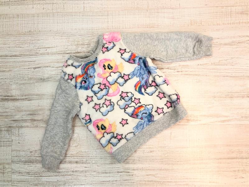 Розмір 92. Колір сірий. Принт - пони. Пухнастий. Утеплений флісом. Ззаду на трьох ґудзиках. Стан ідеальний. Заміри та склад на фото.
