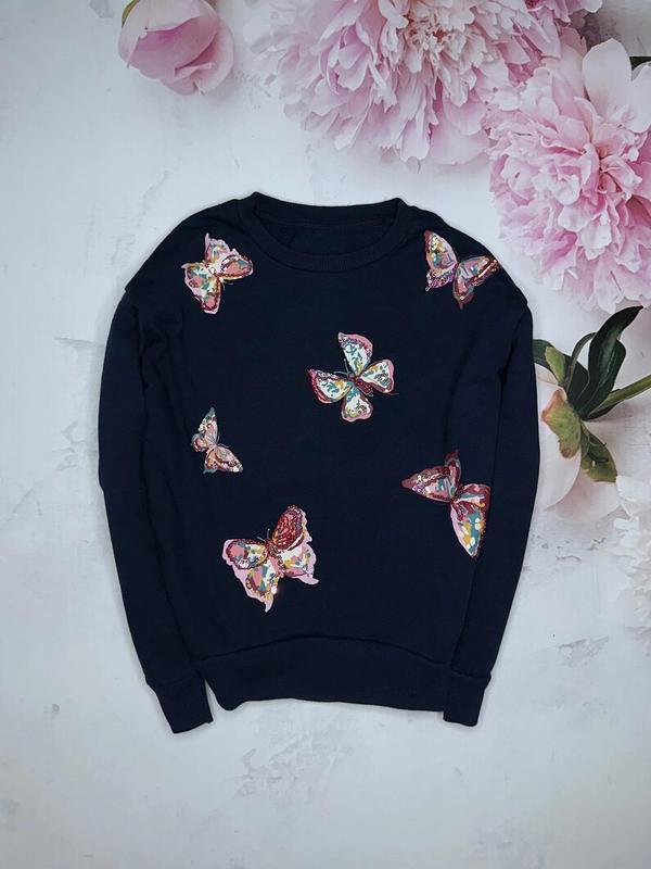 Світшот із метеликами Прикрашений паєтками та бісером Колір темно-синій Стан ідеальний 🏷️Here&There 9-10 лет/134-140 Довжина 48. ПОГ 46. Рукав від шиї 55
