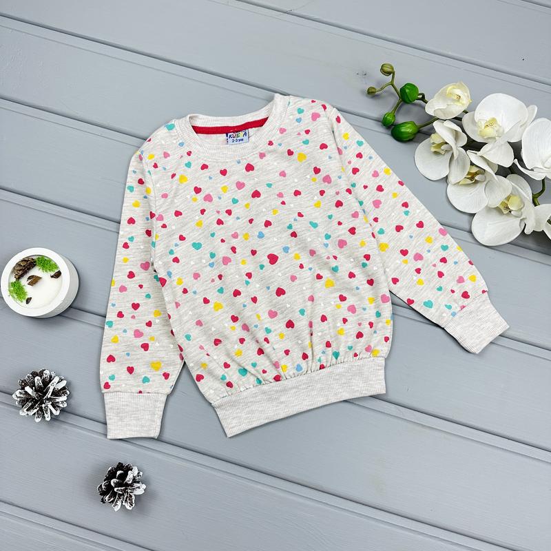 Світшот сердечки. Тканина двунитка. Малюнок-накат. Легенький весняний світшот, гарної якості. Виробник Туреччина Заміри: маломірить (92-98) - довж. 35/рукав.30 /напівобхв 27 (98-104) - довж.37 /рукав. 32 /напівобхв 29 (104-110) - довж. 38/рукав. 34/напівобхв 30