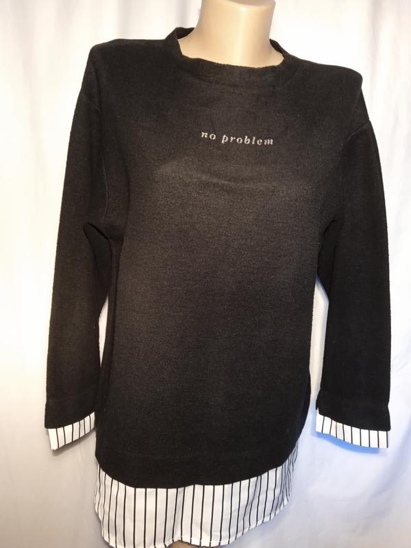 свитшот черного цвета, нарядный,имитация блузки по низу,бренд zara, стан идеальный, длина70,пог54,рукав от горловины70см,склад ткани49коттон,51 полиэстер, ткань мягкая приятная к коже.