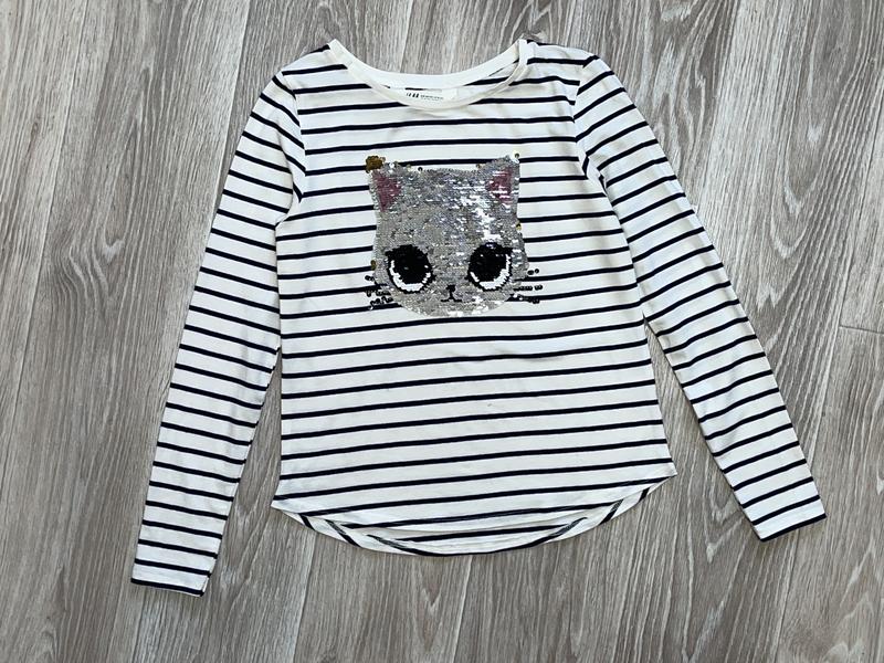 Лонгслів із котиком Паєтки інтерактивні Стан чудовий 🏷️H&M 10-12 лет/146-152 Довжина 47/52. ПОГ 39. Рукав 55