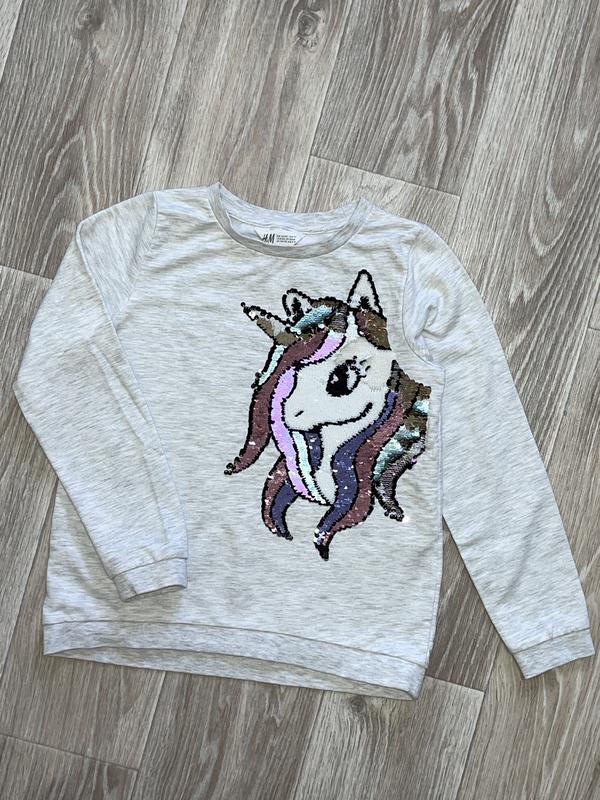 Світшот із єдинорогом Паєтки інтерактивні Усередині на баєчці Стан супер 🏷️H&M 9-10 років/140 Довжина 50. Пог 39. Рукав 50