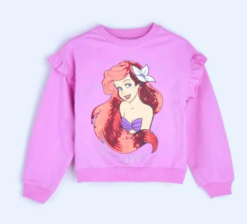 Класний світшот з улюбленою русалонькою всіх дівчаток Аріель. Волосся русалочки повністю прошито паєтками, дуже гарно переливається фото не передає всієї краси. Залишився в двох однакових розмірах 110. Можна для двох сестричок)