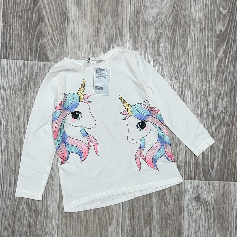 Лонгслів із єдинорогами Колір білий Новий 🏷H&M 🔹2-4 роки Довжина 39/50. ПОГ 29. Рукав 33 🔹6-8 років (7) довжина 45/49. ПОГ 32. рукав 44 🔹8-10 років довжина 50/54. ПОГ 34. рукав 51