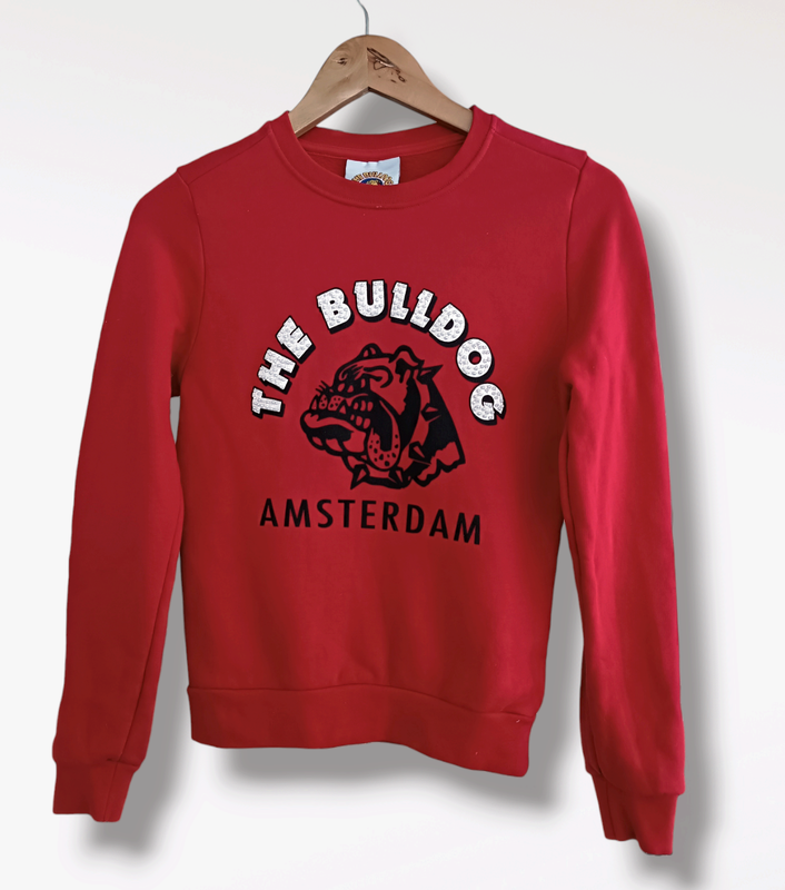теплесенький світшот червоного кольору розмір зазначений S, але орієнтуйтесь по замірах ПОГ 42 см низ 34 см рукав 61 см довжина 56 см 100% бавовна тканина в міру тягнеться