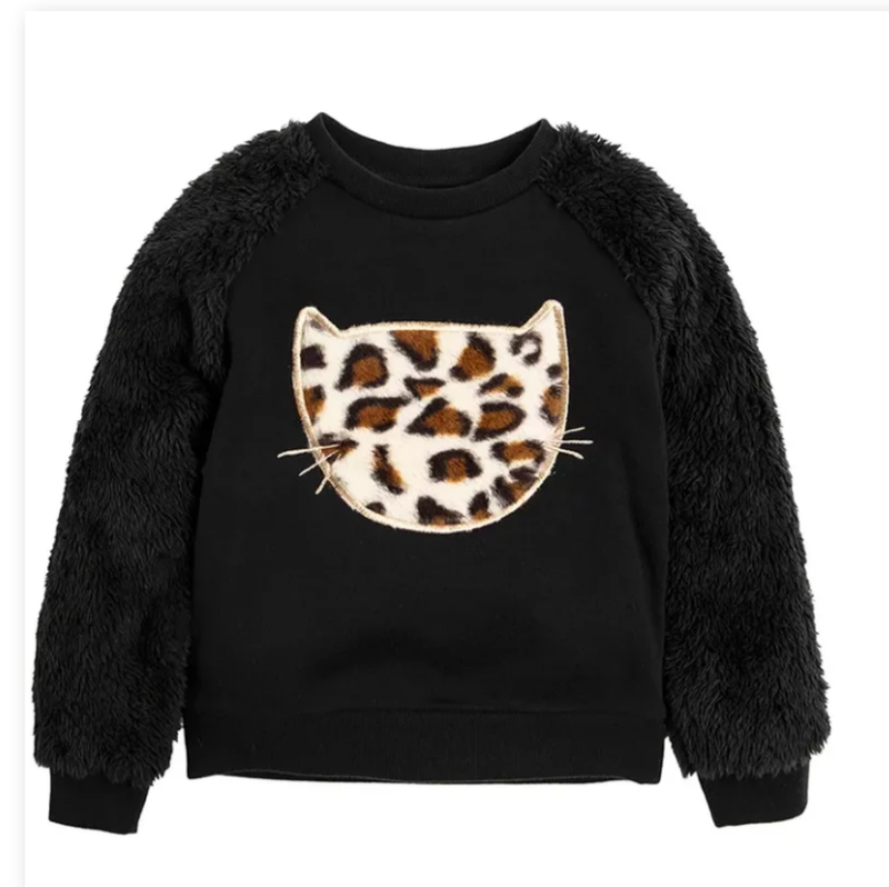 Світшот з кішкою та пухнастими рукавами Cool Club р. 104. Колір чорний з пухнастою аплікацією, перед та спинка з начосом, рукава пухнасті. Нова з біркою. Заміри: ширина під рукавами 30см, ширина внизу 27см, довжина 40см, рукав + плече 41см. Торгу не має! Повернення не має. Наложки не має.