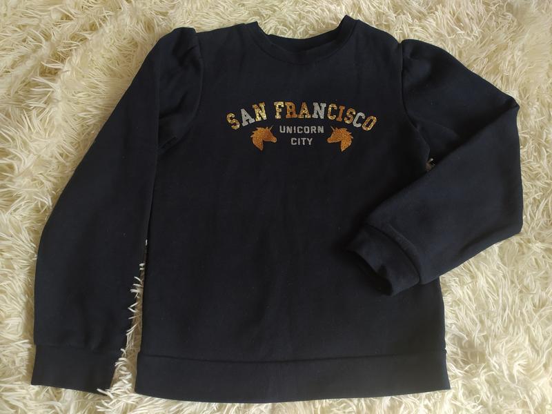 Зручний та стильний світшот від Kiabi,купляла новим,донька вдівала кілька разів,рукав ліхтариком,на утепленні.По бірці на 10років,пишіть ,заміри надам.Ідеальний стан ,близький до нового