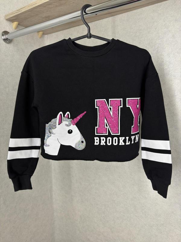 Світшот на дівчинку у ідеальному стані. Вдягався 1 раз. На вік 9-10 років, зріст 140 см. Вкорочений. Довжина - 41 см, ширина- 42 см, рукав - 42 см.