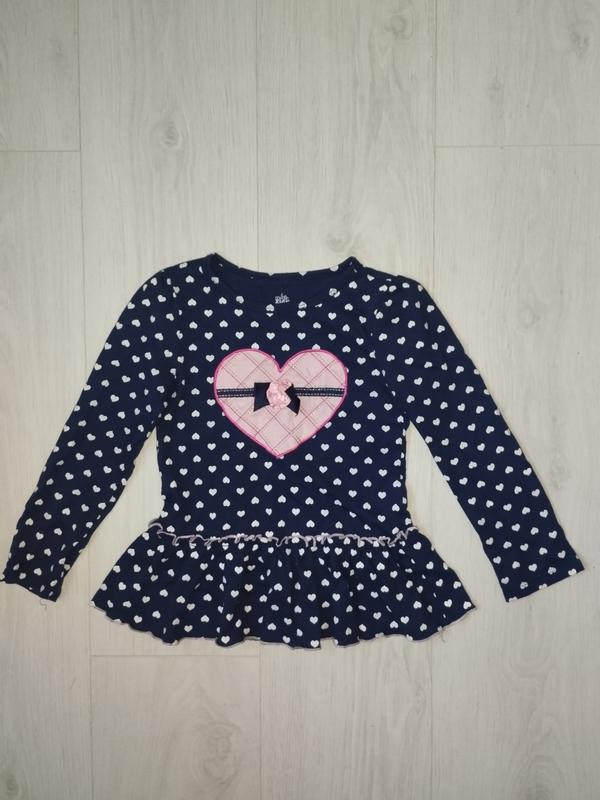Туника фирмы HeadquartersKids, темно синяя в белые сердечки с розовыми элементами декора. По бирке размер 5р. Замеры: пог - 30см, длж.от плеча - 42см, рукав от плеча - 37см, плечо - 4.5см