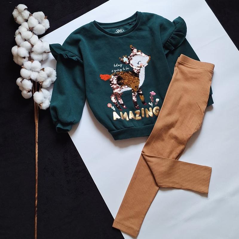 В пості 2 речі ✔️ Світшот зелений з принтом Оленя-паєтки-перевертиши,фліс ✔️ 3-4р ✔️ F&F ✔️ Нового ✔️ довж-40,шир-35,руки-39 від горловини 🤍 225грн ✔️ Лосини беж,базові,без утеплення ✔️ 3-4р ✔️ George ✔️ Нового ✔️ довж-56,крок-39, пояс-24 резинка 🤍 185грн якщо як комплект,зроблю знижку