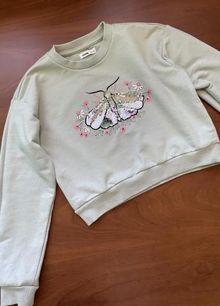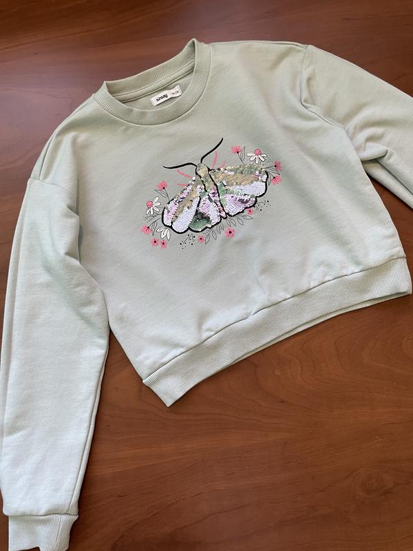 Світшоти в ідеальному стані Має: - круглий виріз - довгі рукави - ребриста обробка - двунитка Розмір 140: Довжина 40 см ширина під рукавами - 42 см рукав від горловини - 58 см. Аплікація - паєтки