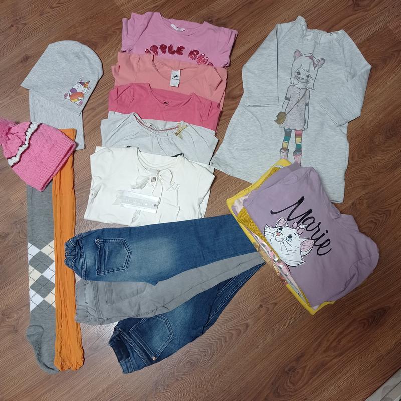Одяг для дівчат на зріст 122, продається одним лотом. Реглан з довгими рукавами 5 шт.,сукня утепленна, джинси 3 шт.,колготи нові сірі,капронові помаранч в ідеальному стані,шапка і хомут сірі,шапка рожева,світшоти утеплені 7 шт. Ще буде подарунок.