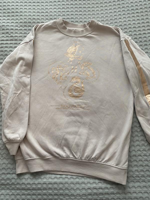 світшот, в гарному бежевому кольорі,шкода що відрізані бірки ,на рукавах і спереді є принт в золотавому кольорі