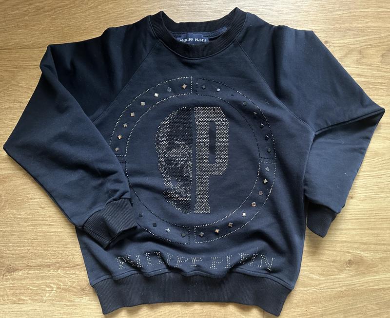 Очень стильный детский свитшот Philip Plein. Состояние хорошее, не хватает нескольких камушек, но этого почти не заметно