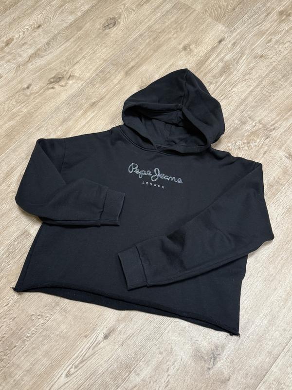 Світшот Pepe Jeans у чорному кольорі, розмір 152 р. 12 р. На флісі. Укорочена модель. Довжина 42 см. НОГ 49 см. Рукав від капюшона 60.5 см. Оригінал. Ідеальний стан.