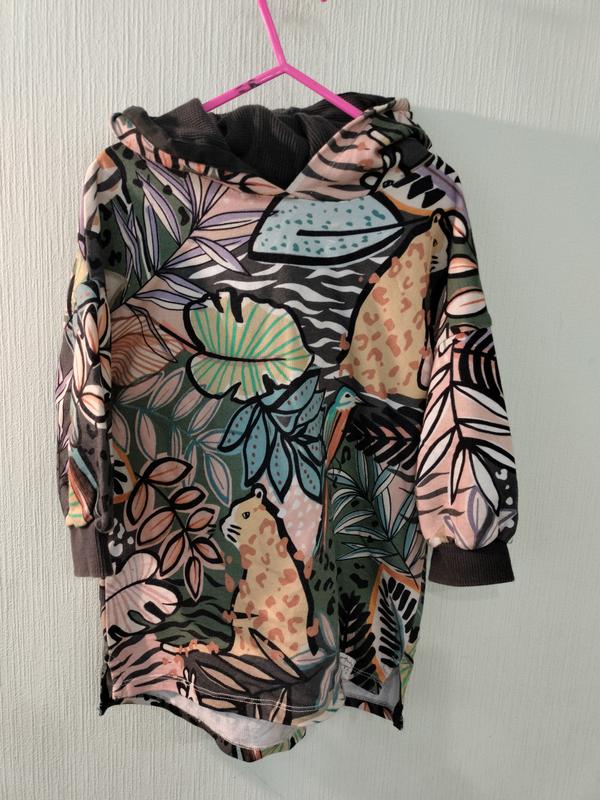 В идеальном состоянии оригинальная удлиненная кофта на девочку 3-4р. Длина по спине до низа 46см, длина рукава с плечом 34см, ширина подмышками 39см. Укороченный рукавчик.