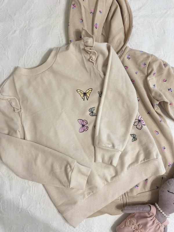 Зручна кофточка в милий принт з метеликами та рюшами на плечах для дівчинки 7-8 років. ✅ Чудовий дизайн, що доповнений рюшами ✅ Нейтральний колір з милим принтом, тож гарно пасуватиме в школу та підійде під будь-який образ. ✅ Заміри: Довжина по спинці 44 см Плечі 31 см Рукав від плеча 43 см Ширина під руками 37 см Ширина по низу 32 см ✅ Стан ідеальний, як новий, жодних нюансів немає.