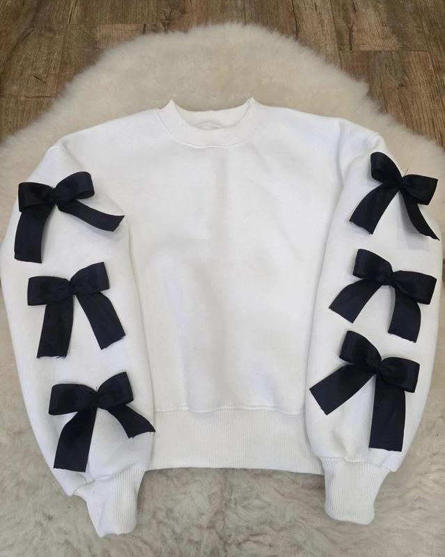 через кнопку купити тільки повна оплата!!! Стилний світшот з бантиками Тканина - турецька двонитка пеньє. 152 довжина - 48см, напівобхват грудей - 47см, рукав від горловини - 61см. Мс