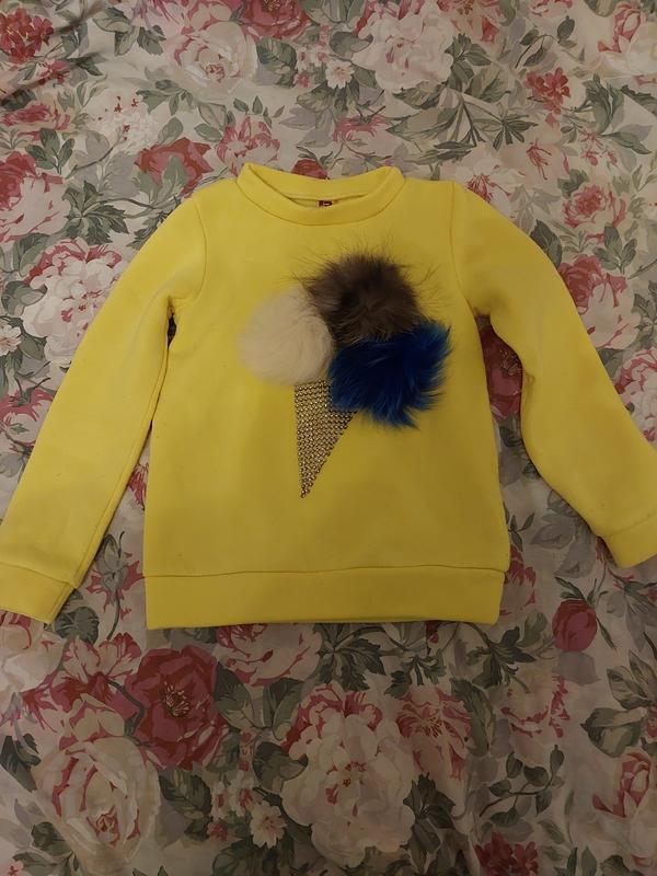 Світшот для дівчинки з аплікацією,,помпони з натурального хутра,один загубили,то зробила з хутра чорнобурки. Подекуди є котунці,збрити машинкою,в мене зламалася.