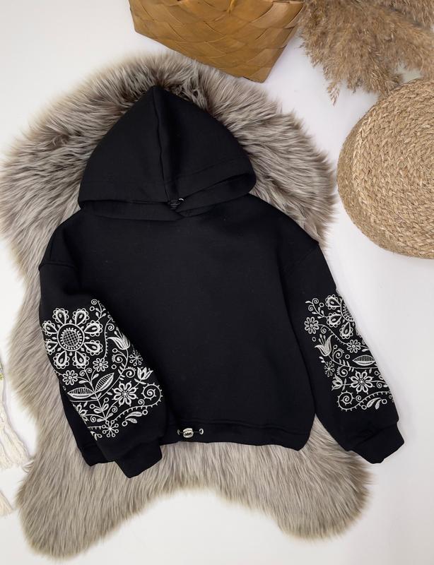 через кнопку купити тільки повна оплата!!! Арт 5758 Худі із чарівною етно-вишивкою на рукавах з капюшоном та утяжкою понизу Тканина-турецька трьохнитка на флісі дуже приємна на дотик СУПЕР ЯКІСТЬ! зріст/довжина/пог/рукав від горловини похибка+-2см 152-158/52/57/64-2шт