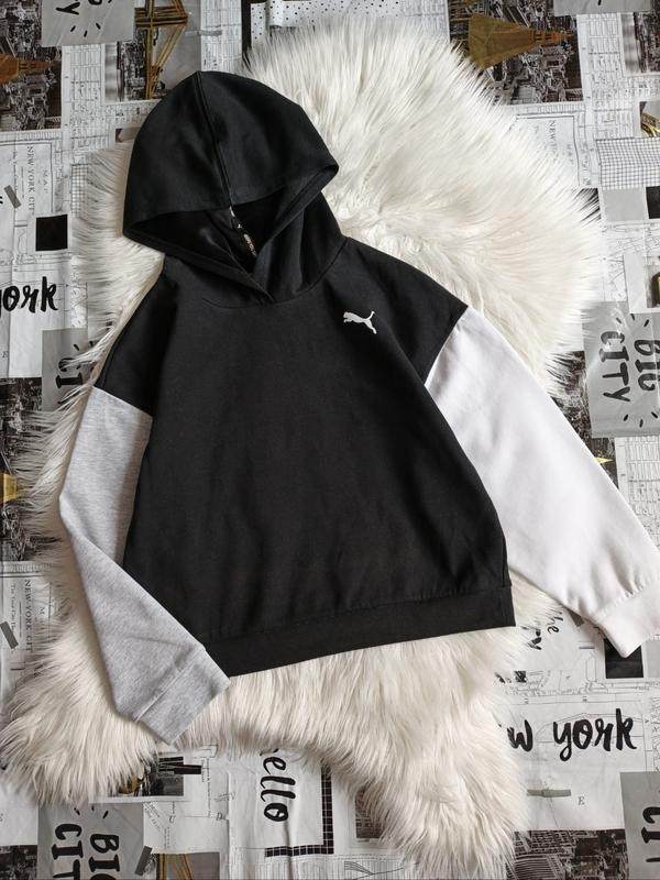 кофта Puma,розмір з бірки 11-12 р. 152 см. маломірить. заміри є на фото. усі нюанси,також,показала на фото, заді збоку пошкодження і пляма на білому рукаві.