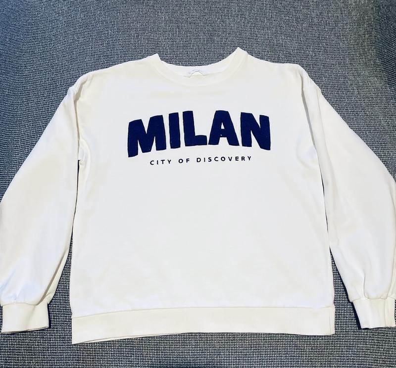 Дитячий світшот оверсайз з малюнком MANGO. 100% бавовна, вишитий рельєфний і фактурний принт "MILAN", білий колір з написом на спині 13-14 років (164 см) Заміри: Довжина виробу - 60 см, обхват грудей - 50 см, ширина виробу знизу - 48 см, довжина рукава від шиї - 69 см, ширина рукава - 16см