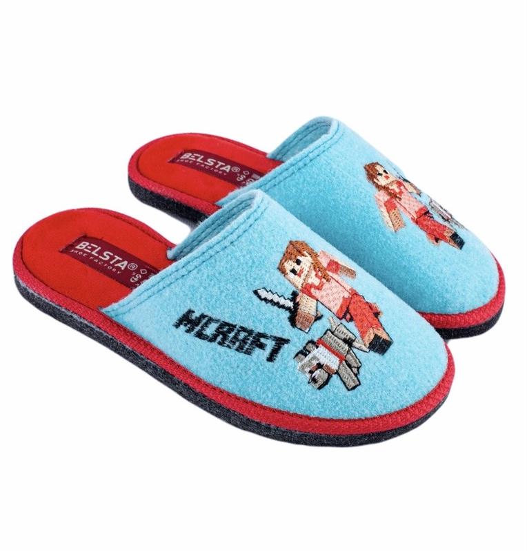 Дитячі закриті капці української фабрики БЕЛСТА, з повсті бірюзового кольору, прикрашені вишивкою у вигляді героя комп'ютерної гри MCRAFT, на устілці з велюру. Безпідошовні, на підошовну частину нанесена шовкографія з пластизольної фарби, що перешкоджає ковзанню.