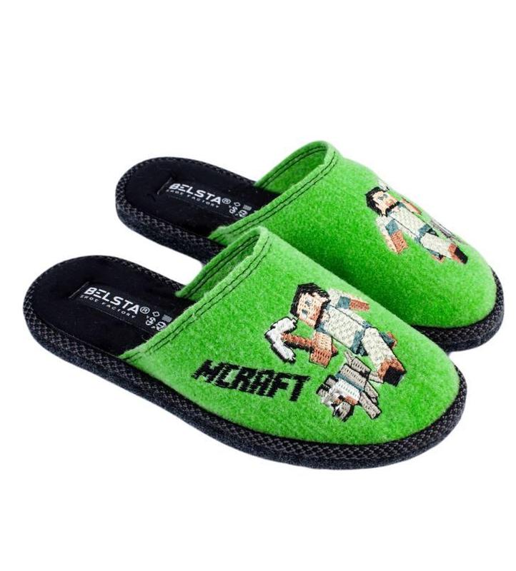 Дитячі закриті капці української фабрики БЕЛСТА, з повсті світло-зеленого кольору, прикрашені вишивкою у вигляді героя комп'ютерної гри MCRAFT, на устілці з велюру. Безпідошовні, на підошовну частину нанесена шовкотрафаретний друк з пластизольної фарби, що перешкоджає ковзанню.