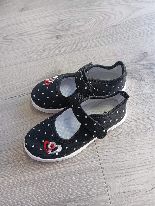Тапочки для дівчаток, чорні з принтом дрібний горох, спереду сердечка, на липучку.